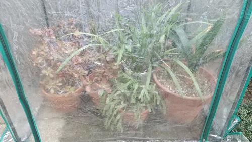 多肉植物などをテントに移動しました。今年2月の突風でテントが外れてしまい、みんな瀕死の状態になってしまいましたが、何とか持ち直しています。