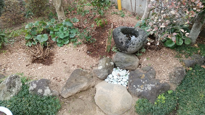 10月、なんちゃって「つくばい」ですが作り直しました。家を建替えた時、納得の石組をしないまま15年が過ぎました。テレワークが無かったら、作り直すことはなかったです。水鉢:父(当時運転免許無し)が酒匂川から運んだ石を父が彫ったもの、周りの岩:父の実家の柿の木の下にあった岩、恐らく昔の庭石の一部。白い小石:荻野が国府津の海岸から拾ってきた小石。この写真は12/31撮影で、左から角紫陽花(母方祖母の形見)、つわぶき、馬酔木、レンギョウ、シャリンバイ です。シャリンバイは枯れてしまいましたね。水鉢を移動中に、後ろのモミジと水鉢で右手の中指を挟んでしまい、只今は爪が生えかわっている最中です。