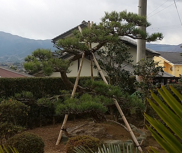 北山杉を剪定してもらっている植木屋さんに、「松が欲しい」と相談したところ、春3月にこの松が我が家にやってきました。植木屋さんの終活で手放す秘蔵っ子だそうです。道路(町道1号)が狭くて重機を使えないので職人5人+家族3人で運んで植え付けました。「もみあげ」という作業(昨年の葉を抜く)を妻と二人でやって、写真のように「能舞台のような松」に仕上がりました。これは巨大盆栽だと思います。父が大変に喜んでくれているようで良かったです。暖かい日はたたきに椅子を出して、門番のように眺めています。