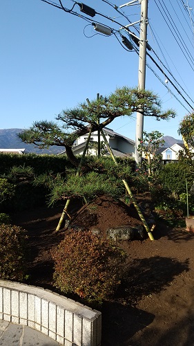 3/14、4月に植える予定の「松」が前倒しで着ました。人工が突然揃ったようです。高さ2m以上、幅3m以上、重さ150kg以上、山ではユンボでトラックに積み込み、我が家では人力(植木屋さん4人、荻野家3人)で運びました。みかん箱の2箱重ね+プラスチックの箱を橋桁として、トラックから2連梯子を伸ばして、コロを噛ませて築山まで6m位引き摺ります。梯子が折れてみかん箱が潰れてしまうのではないかと大変に心配しましたが、梯子もみかん箱も丈夫でした。