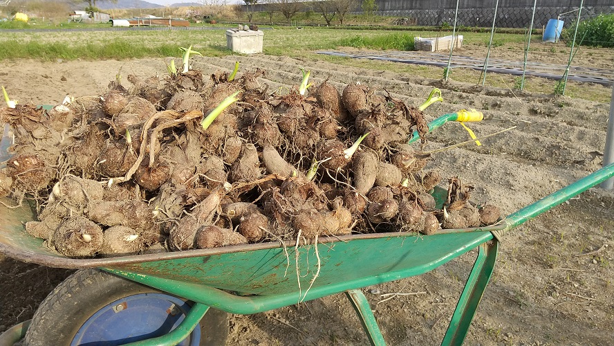 3/27は、雨が降る前に里芋の準備をしました。親芋を掘り上げましたら、芽が出ていました。こんなに要らないので、もっと早く掘り上げて食べればよかったと思いました。