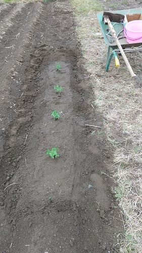 3/7、ジャガイモの隣にさやえんどうの植付をしました。さやえんどうは、種を撒いて作るものと思っておりましたら、農協で苗が売っていたので思わず買ってしまいました。たまたま写真の右側に半分写っている一輪車に鍬とかバケツとか草かきとか必要な道具を入れて畑まで通っております。
