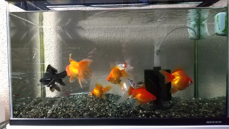 裏の水道で道具を洗っていましたら、水槽が気になりました。冬は掃除をしないので、12月から掃除をしていません。もう春ですし、長靴に作業着ですから次いでに洗うことにしました。一番根性が悪い「黒い出目金」を一番最後に入れて終了です。