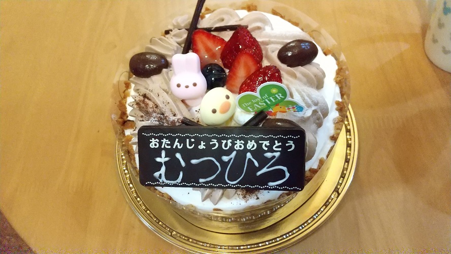 丸いケーキも買いました。自分のケーキですから、ケチってシャトレーゼで買いました。名前を聞かれたので、「むつひろ」と答えました。蝋燭の本数を聞かれたので「5本」と答えました。蝋燭の大と小とどちらにするかと聞かれましたから、「小」と答えました。「幼稚園5歳のむつひろ」という設定で購入しました。意外と美味しかったです。
