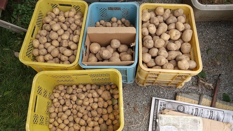 ジャガイモを傷つけないように手で掘って、一輪車で畑から妻の実家まで3往復して運びました。日陰で一日干して、大中小と分けて、物置に仕舞います。種芋は5キロです。今年は出来が良いです。