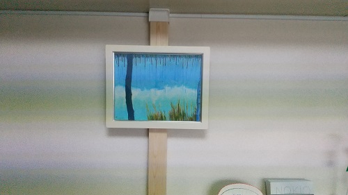 石膏ボードの壁に釘を打つのは嫌なので、パーテーションに絵を飾っていましたが座りが悪くて気に入りませんでした。ツーバイフォーの木材を突っ張り棒に変身させる道具をコメリで見つけましたから、「絵を飾る為に釘を打ちつける棒」を立ててみました。飾る絵は、平澤政行さんからの事務所開設お祝いです。写生旅行で描いたという北海道美瑛町の白金青い池です。