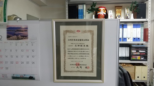 パーテーションには、明電印刷の応接室に飾ってありました「荻野の印刷営業士のお免状」を飾りました。