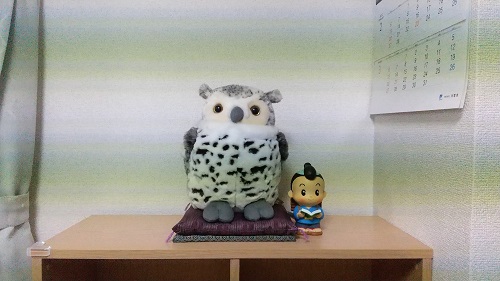 応接テーブルに鎮座していましたフクロウのぬいぐるみ(畳と座布団付)と農協の金次郎は、東側に新設しました製品見本の整理棚の上へ移動しました。