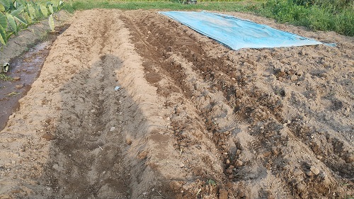 14時30分15時までジャガイモ用肥料と腐葉土をコメリで一輪車で買い付け、15時から16時30分までじゃがいも2キロ(2畝と半分位)を植付た。残り(青いシート付近)は大根を植える予定。