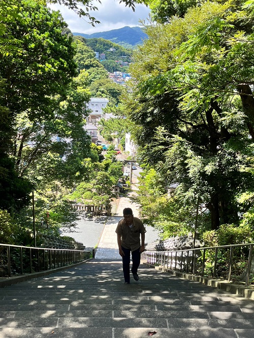 大石段は綺麗な青というか緑というか、兎に角立派でした。108段だから、煩悩を焼き尽くしたかもしれません。玉垣は石屋と漁業と青木さんだらけです。